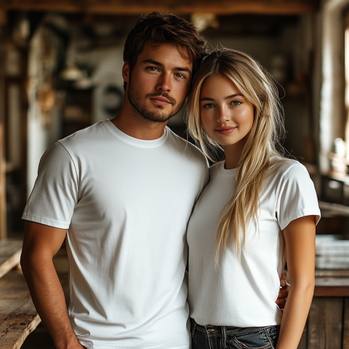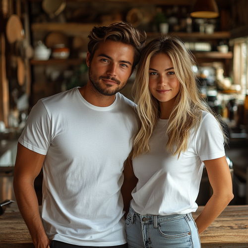 White T-shirt mockup. Young couple in their modern kitchen posing for an amateur photo shoot. Couple's figures are turned to the camera. Kitchen is decorated for Thanksgiving holiday. Man with short hair is standing next to his wife who has her blonde straightened hair lying behind her back and she is holding her hand on your back. Girl's hair is pulled back in a bun. Both have big smiles on their faces. There should be wooden work surfaces in front of them. There is a lot of light in the room, nice family atmosphere, no inscriptions on the T-shirts--ar 30:30--raw style --style raw --s 750