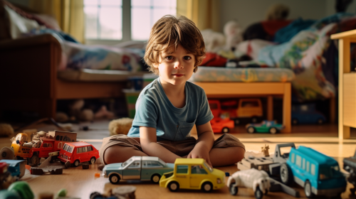 3 year autistic boy playing with toys in home, high details, --ar 16:9
