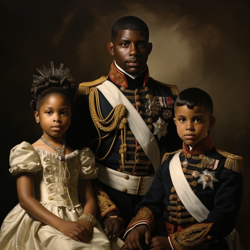 **royal portrait of a set of adult black siblings with two brothers and two sisters, beautiful black noblewoman and handsome black nobleman, one of the brothers in a white admiral uniform, one of the brothers in a three piece suit with blond hair, the sisters in regency style dresses with empire waistline dresses, formal portrait of four siblings, adult siblings, aristocrats, light brown skin noblemen, Bridgerton, in the art style of Kehinde Wiley --s 250 --style raw
