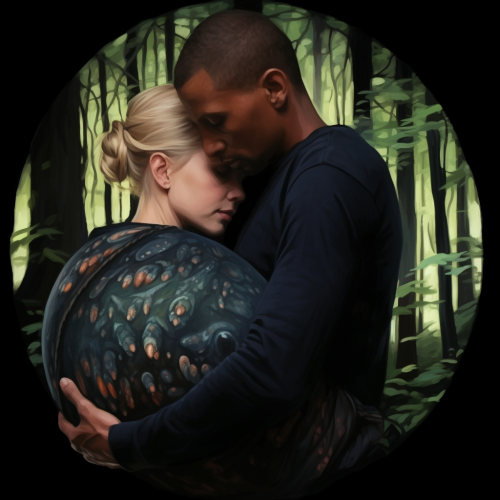 in the forest, a blonde woman with short hair and a pregnant belly, a window into her belly you can see the tiny babies, her black bald husband is hugging her from behind holding her belly, fantasy