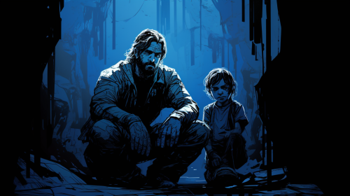 blue white and black ink drawing Low-Angle Shot, cyberpunk father with a missing left arm and son in rags sitting in a dark cave flashlight in the middle between them --ar 16:9