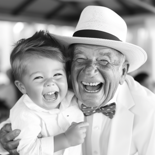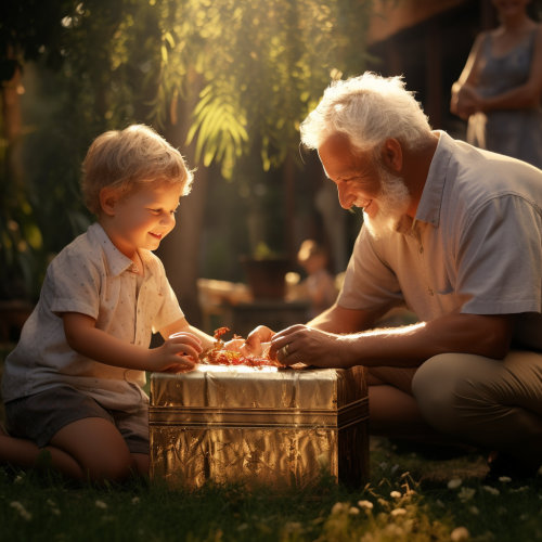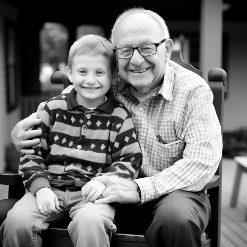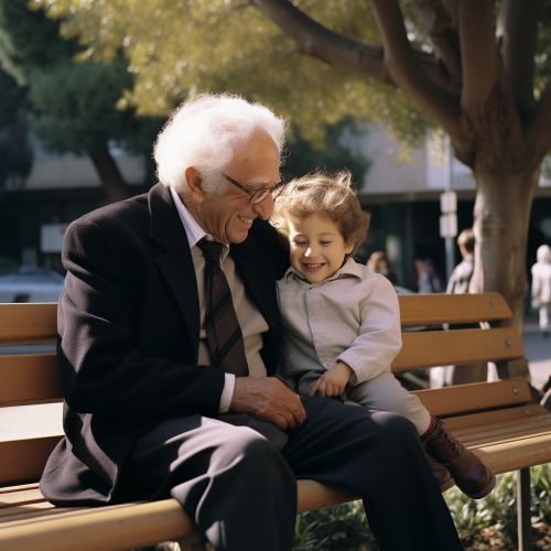 An ultra-realistic photograph shot on kodak ultramax 400, equipped with a 50mm lens at F 3.2 aperture setting, portraying an elderly man sitting on a park bench with his grandson. The image, shot in high resolution and a 16:9 aspect ratio, captures the subject’s personality with stunning realism –ar 16:9 –v 5.2 –style raw --c 25