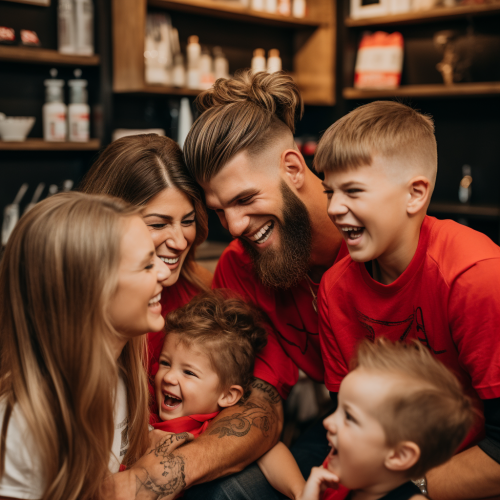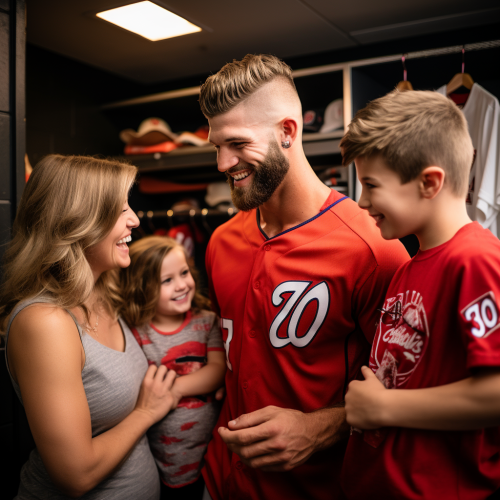 bryce harper, his wife, and his children laughing at a 28 year old man with a bowl cut, light brown hair, and a weak chin who is wearing a graphic tee
