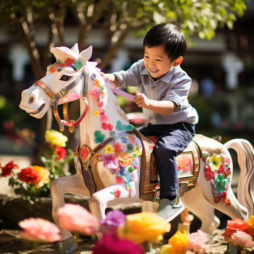 "In a serene Chinese garden, a young Chinese boy is joyfully playing on an exquisite wooden horse. His excitement and happiness shine in the sunlight, much like the colorful flowers in the garden. The boy is dressed in traditional Chinese attire, reflecting a connection to family traditions and culture. The garden is surrounded by a variety of beautiful blooms, creating a harmonious environment. The entire scene is filled with childlike wonder and joy, capturing the heartwarming atmosphere of family and traditional culture."