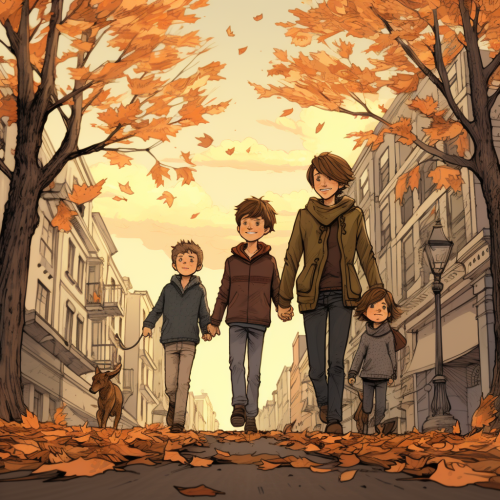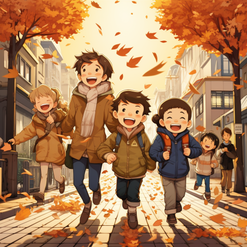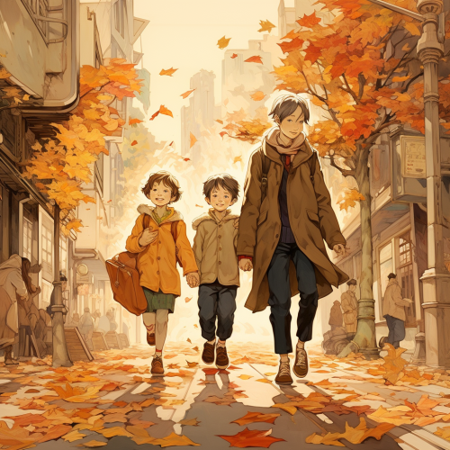 Cool cartoon, family with 5 members, father mother and 3 boys, walking street, fallen leaves, japanease