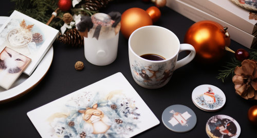 flat lay layout of muliple sublimation products that have different original cute designs, laying on a table, (do not use copywrite examples) products should be specifically coffee mugs, tumblers, bookmarks, mousepad, photo realistic, Christmas theme, in the distance --ar 13:7