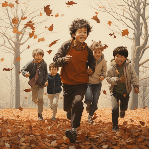 Cool cartoon like spyderman, A family with 5 members, small boys range 2-6, all japanease, all smilling, walking street, fallen leaves