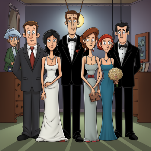 a 50 year old man in tuxedo and a 50 year old woman wearing a wedding dress standing next to each other with their 12 year old son and 17 year old daughter standing in front of them, Comic style Gary Larson --s 250