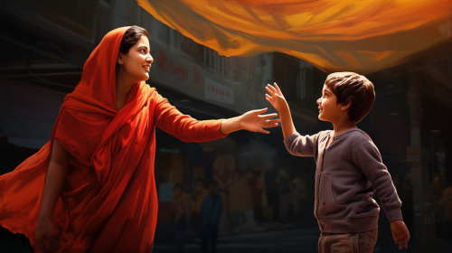 A mother in tradtional indian clothes, hand reaching out to child wearing a hoodie and jeans, coming towards mother --ar 16:9