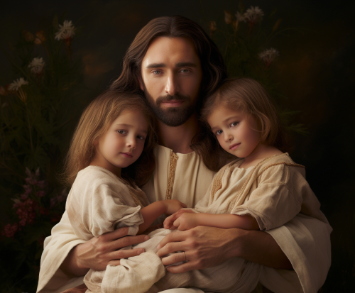 Jesus Christ with 2 kids, holly, joyful, peaceful, happiness --ar 6:5