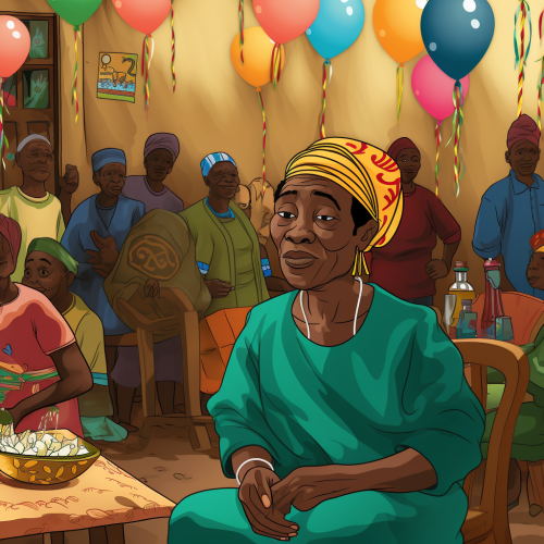 a Guinean grandmother seated at a party in the village center cartoon style.
