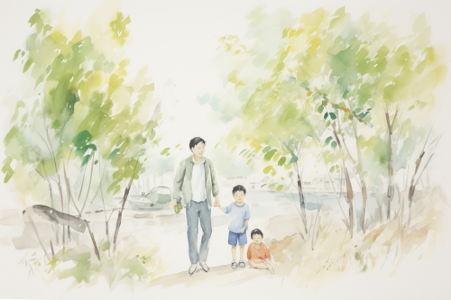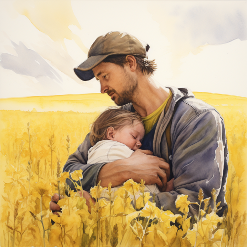 water colour painting of a man holding a sleeping baby and looking over a yellow field