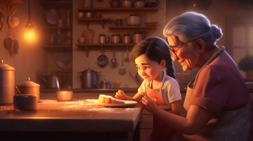 A heartwarming scene of a little girl and her grandmother baking together, warm lighting, cozy kitchen atmosphere, focused on the joy and love between the two, Photography, Canon EOS 5D Mark IV, 50mm lens, soft natural lighting, --ar 16:9 --v 5.0