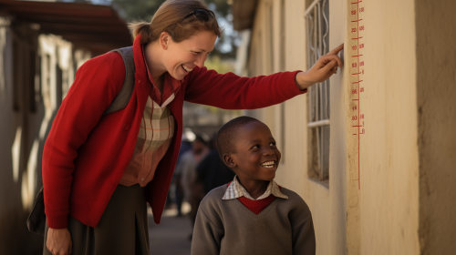 young boy smiles while mom is measuring his height on his head, in Zimbabwe, next to wall, mesuring marks on wall, wearing school jersey, award winning photography, natural light, white and red --ar 16:9