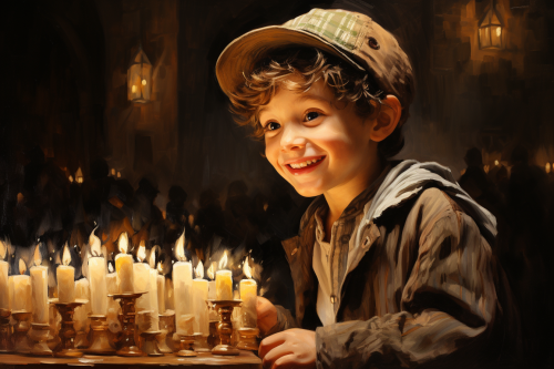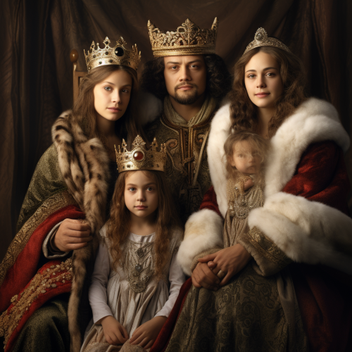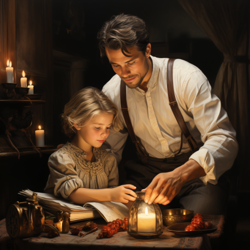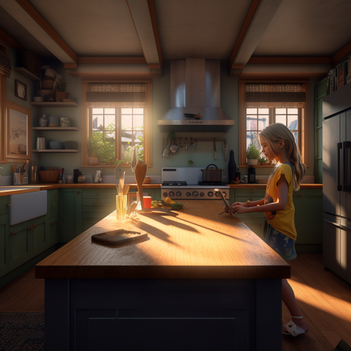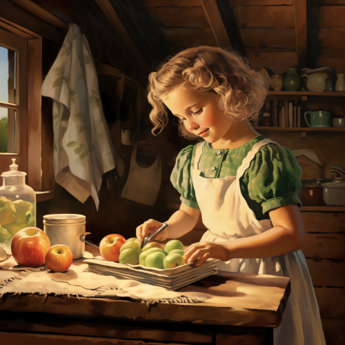 A heartwarming scene of a little girl standing on a wooden stool in her cozy family kitchen. Her glossy chestnut hair is tied back as she concentrates intently, peeling and slicing apples into perfect thin slices. Twinkling blue eyes follow every word written in the open cookbook beside her - Granny Smith's famous apple pie recipe passed down through generations. Her mother gently guides and encourages her while they mix the dough for that oh-so-perfect crusty pie shell. Nearby, Papa shares tales from his childhood, reminding us of the importance of patience and listening attentively to our elders.