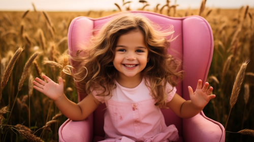 brunet daughter sitting in a pink chair in the grass waiving at the camera --ar 16:9