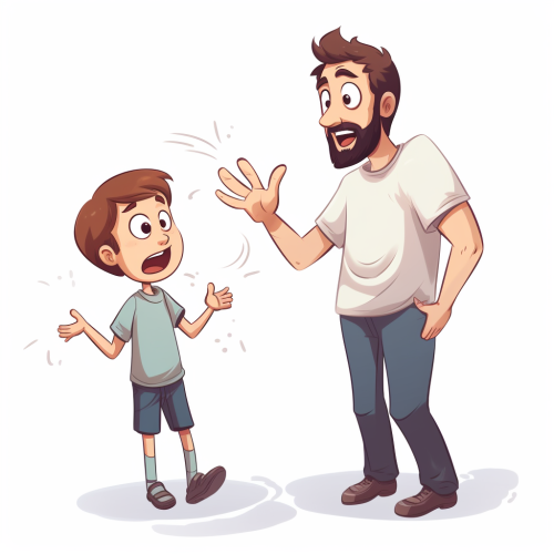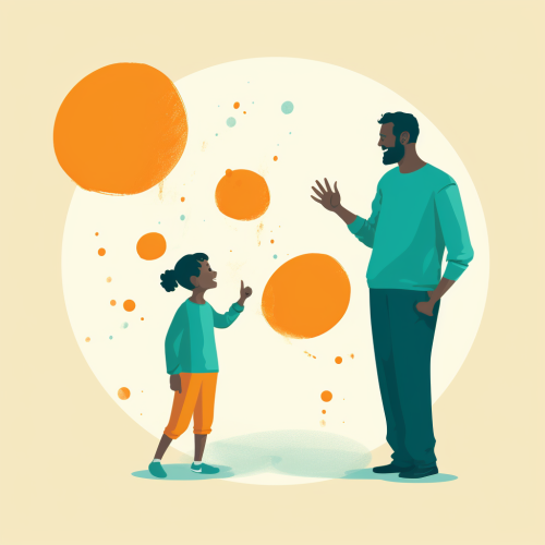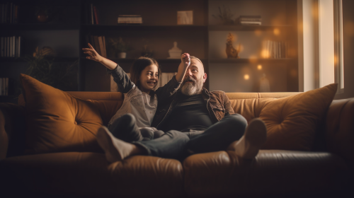 photo of a 13 year old child and dad sitting in a sofa waving to the camera, smiling in the style of golden light, photorealistic fantasies, sigma 85mm f/1.4 dg hsm art, photorealistic pastiche, monumental, expressive, wide --ar 16:9 --v 5.0