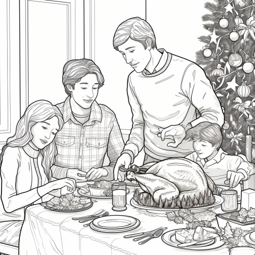 coloring page for adults, famiily at eating christmas dinner, thick lines, medium detail, no shading ar 9:11