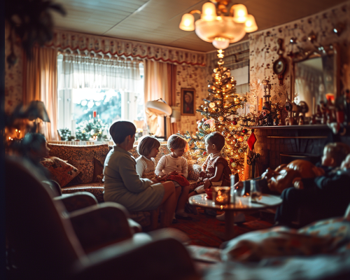 fisheye, turbulent blur, dynamic, mid format vibrant color Photo through a Zenit Helios-40-2 f/1.5 lens of a Hasselblad camera, A 1960s swedish family with 2 children with real faces in the style of simon stalenhag dressed in 1960s cloths, celebrate Christmas inside at home, talking to each other in a rural setting that suggests a stark frontier environment, christmas tree, Roasted Turkey, --ar 5:4 --stylize 250 --v 6.0