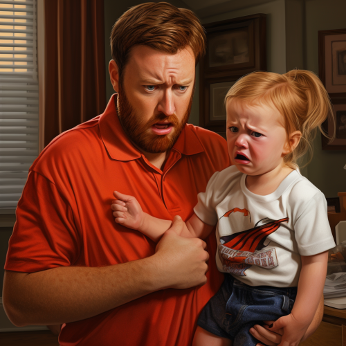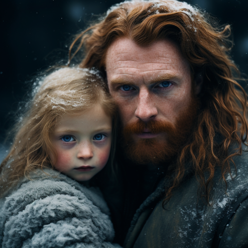 a man with ginger curly long hair and freckles, beard, blue icy eyes, father, daughter