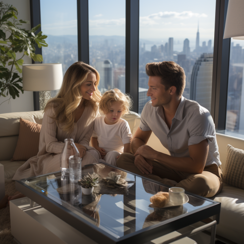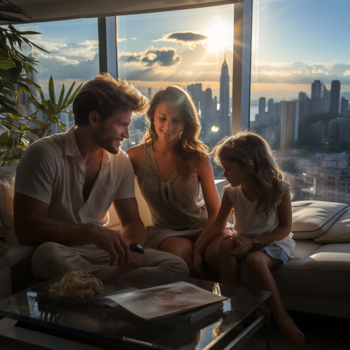 family in a cosy living room in a high-rise apartment with panoramic windows showcasing Panama city skyline, light colors, midday , photographic style, realistic --ar 1:1 --s 750
