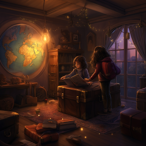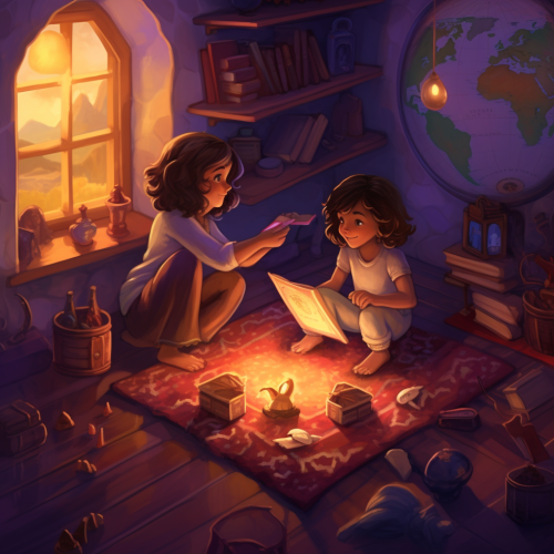 Brother and sister are playing in their cozy bedroom, surrounded by toys and books, then they found a mysterious, glittering map hidden in an old chest. --style yIOho48sAf23MRw44dmp8Ipw
