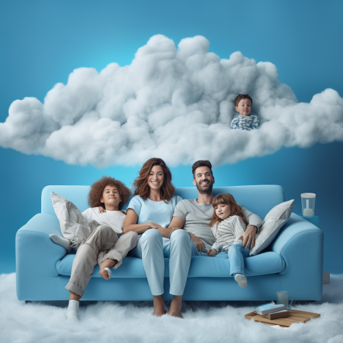 photo, family are sitting on a fluffy sofa and watching tv, light blue tones, a solid background