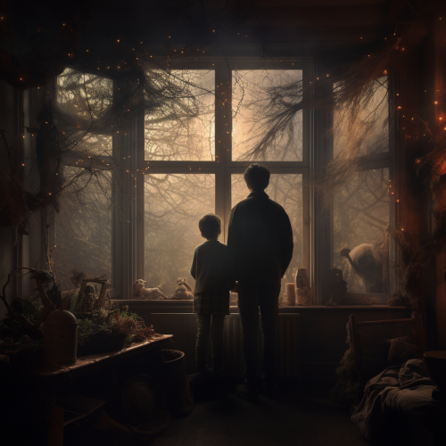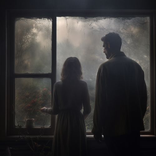 a mother and dad inside a traditional home trying to look out a window that is foggy, outside are kids playing hard to see