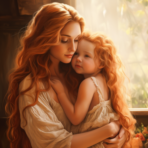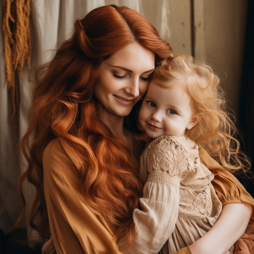 a long haired ginger woman holding a beautiful blonde toddler baby girl, motherly love, hugs, kisses, happy, cottage core from behind