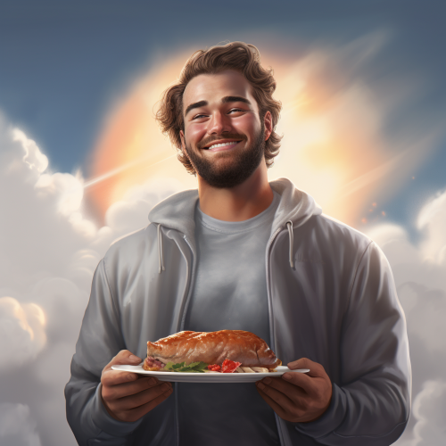 man in matching gray hoodie and gray sweatpants, sitting happily on couch, surrounded by clouds, mom handing him a plate of meatloaf
