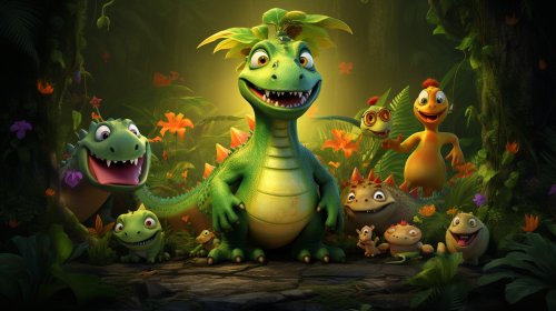 an image of a dinosaur with green skin sitting in the jungle, in the style of playful innocence, zbrush, cute cartoonish designs, bill gekas, vibrant, lively, interactive, tim shumate, standing among his big and mature family members, fairy tale, cartoon style, size 16:9, --ar 16:9