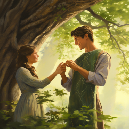 A lush tree extends two branches from the middle of its trunk as if they were hands. To its right, a happy young man holds the tree's left branch as if they were holding hands. To the tree's left, a smiling woman holds the tree's right branch as if they were holding hands. Full body shot, forest background.