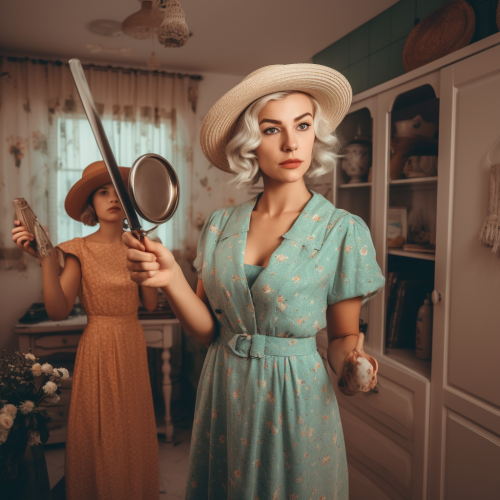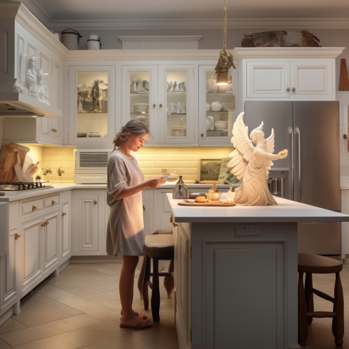 Create an image prompt with these details: "A photorealistic scene in a bright, beautiful kitchen where a traditional wife influencer is seen giving her 8-year-old child an angel figurine and a small spear. The scene is captured from a hidden iPhone camera placed on the table, creating a subtle voyeuristic feel. The kitchen is well-lit with intrinsic details like fresh flowers, polished countertops, and a warm, inviting atmosphere. The child looks curious and slightly puzzled, while the mother has a gentle, instructive expression." --v 5.0