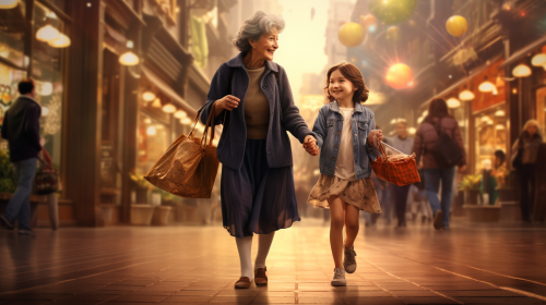 realistic grandmother and young girl running around the mall buying lots of stuff --ar 16:9