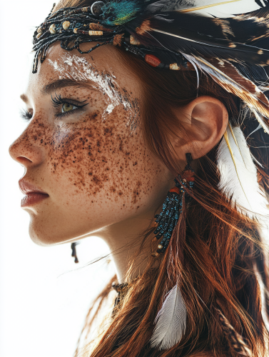 photography portrait of tracker/fantasy tribal freckled girl , white background, feathers and beads in hair. Shoulders and up, show all of her hairs, --v 6.1 --ar 3:4