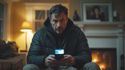 A weary man in his 40s, Joe, sitting in a dimly lit living room, watching the evening news. Headlines about corporate greed and environmental disasters flash on the screen. He sips a drink and scrolls on his phone in frustration. The camera zooms in on his phone, showing social media posts about protests that lack traction ; Annie leibovitz style photo, high tonal contrast, hq colour photo set, arches, vogue velvet, iridescent, holographic, full pose, transparent details, colourful, photorealistic, highly detailed, transparent parts, looks like a professional hdr photograph in a fashion magazine, editorial photography, global lighting mood lighting, post-processing, glowing shadows, chromatic aberration, black and white balance, dispersion, beautiful cinematic lighting, lumen reflections, post-production, high-fashion, tone mapping, shaders, 3d diffraction gradation, octantian rendering, detailed, hyper-realistic, 16K, --ar 16:9 --stylize 750 --v 6.1