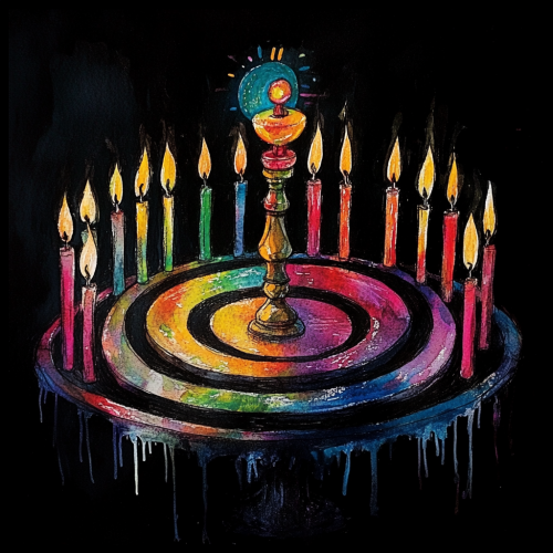 beautiful postcard with the holiday of Hanukkah. Hanukkiah with 9 candles and a spinning top. Bright illustration in watercolor technique on black paper with shiny paints