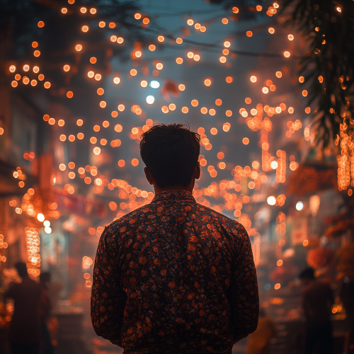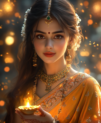 A beautiful, realistic scene depicting Lord Ram and Maa Sita appearing together in a radiant glow, blessing everyone for Diwali. Lord Ram, holding his bow with a serene expression, stands beside Maa Sita, who is dressed in traditional attire with a gentle smile. They are surrounded by soft, golden light, symbolizing divinity and warmth. The background shows festive Diwali decorations, with glowing diyas (oil lamps), rangoli patterns, and fireworks lighting up the night sky. The atmosphere is filled with reverence and joy, embodying the spirit of Diwali as a celebration of light, blessings, and happiness.