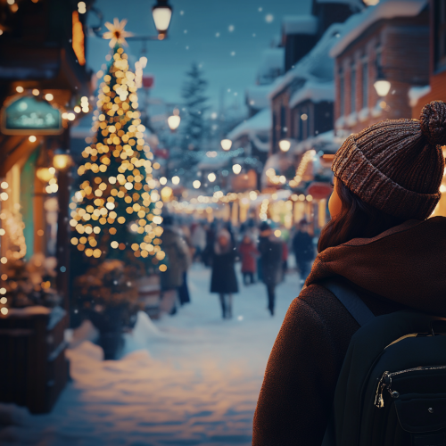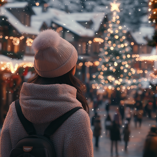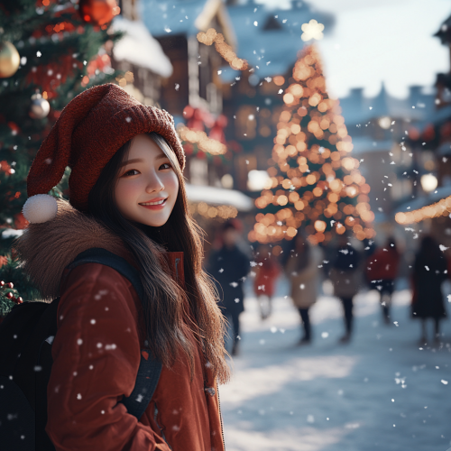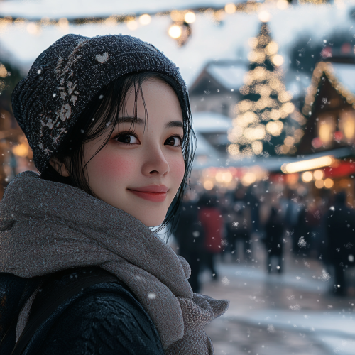 Close-Up shot, back view, looking at behind, hyper realistic, winter, dusk, sunny, korean Solo, European country style, snowy town with Christmas tree, decorations, wide square, festival, many people on the street, beautiful fairy tale atmosphere, lights, smiling American woman, brick western style buildings, Canon EOS R5 with a 200mm lens, --style raw --v 6.1 --ar 1:1