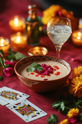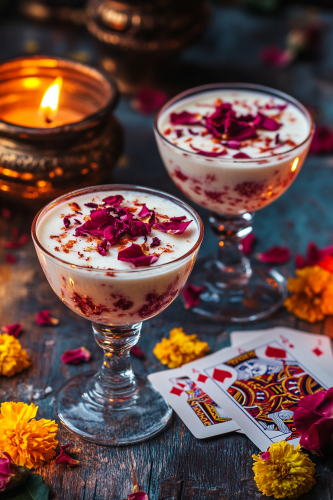 bright and fresh image of rose petal shrikhand on table with playing cards and marigold flower and diyas as props and there ia also a gin cocktail goblet glass on the table in a brightly lit image --ar 2:3