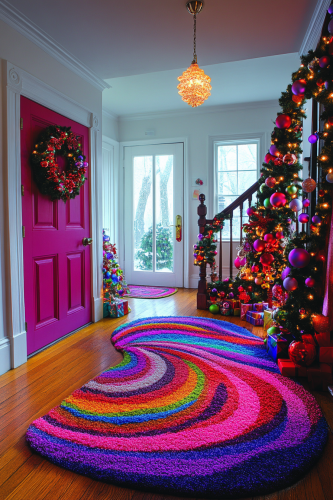 Create an image of an entryway in an apartment bursting with colorful festive Christmas decorations. Brightly colored garlands, a vibrant wreath, and a cheerful holiday rug should make the space lively and welcoming. Fun, whimsical ornaments could add to the playful atmosphere. The photograph should capture the entire entryway, showing how it sets a joyful tone for the apartment. This vibrant and inviting image should draw viewers interested in colorful festive Christmas ideas. Neat and organized. Camera: DSLR - Canon EOS 5D Mark IV. Lens: Canon EF 24-70mm f/2.8L II USM. Composition: Wide shot, room-centered, horizontal orientation, balance between furniture and space. Film: Digital, high resolution, color profile sRGB. Camera settings: ISO 400, f/2.8, 1/60 sec. --ar 2:3 --v 6.1 --s 250