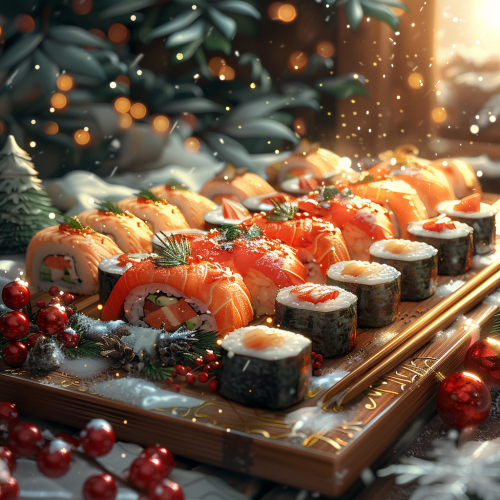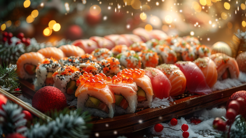 Festive Christmas-themed background for a sushi restaurant flyer, featuring sushi dishes like nigiri, sashimi, and maki rolls arranged artistically. Subtle holiday decorations with red and green accents, snowflakes, holly, and twinkling lights. Cozy and warm atmosphere, with wooden textures, chopsticks, and soft glowing lights for a festive Japanese aesthetic. No text. --ar 16:9 --v 6.0 --s 750