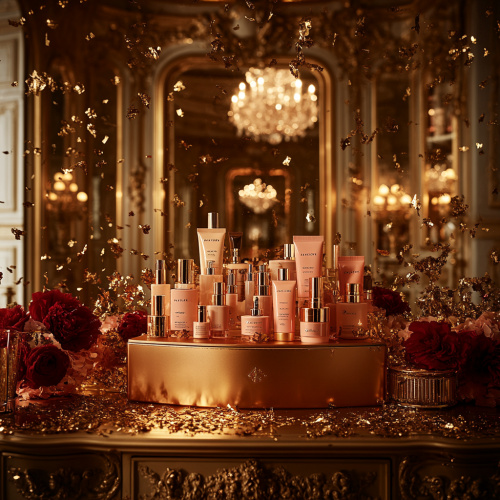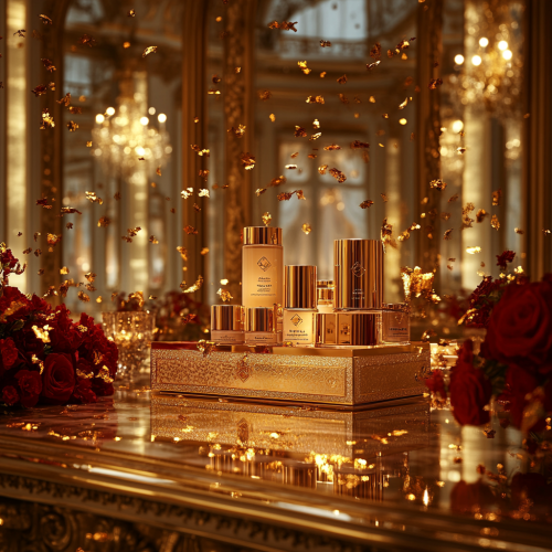 large gold box in spotlight with multiple beauty products in front, evening, ornate gold room with large mirrors in background, gold confetti falling, warm light, red flowers, festive --style raw --v 6.1 --s 250
