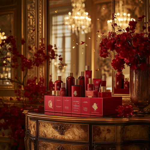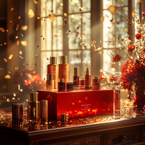 large red box in spotlight with multiple beauty products in front, bright, abstract ornate gold room with large windows and mirrors in background, gold confetti falling, warm light, red flowers, festive --style raw --v 6.1 --s 250