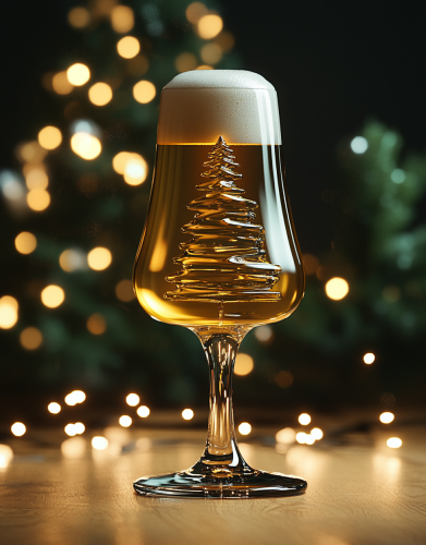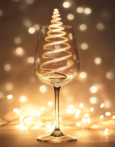 a glass of wine with the stem of the glass in the shape of a Christmas tree, Christmas background with Christmas tree and lights, light background --ar 45:58
