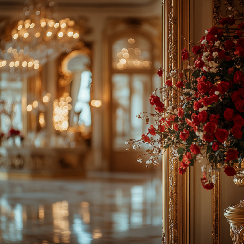 closeup of gold door, out of focus beautiful ornate gold room with large mirrors and chandelier in background warm light, red flowers, festive --style raw --v 6.1 --s 250