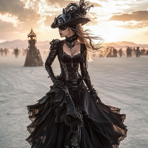 the most wonderful women outfit for burning man. The inspiration is half gothic romantic half steam punk. Ultra realistic style. Show the festival in the back ground