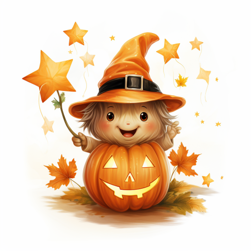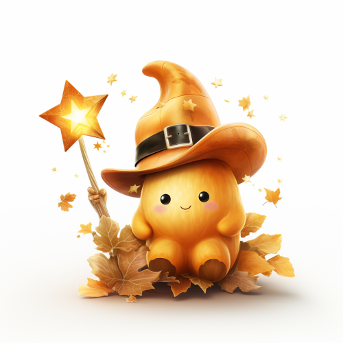 A cute pumpkin wearing a magic hat, waving a magic wand in his hand, the magic wand is shining with stars, and behind it are golden maple leaves falling down, which is very festive. PNG with white background --v 5.2 --s 250