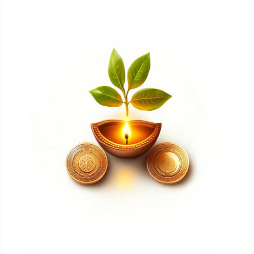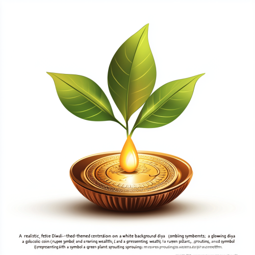 "A realistic, festive Diwali-themed illustration on a white background, centered and combining three symbolic elements: a glowing diya (representing wisdom), a gold-colored Indian coin with a rupee symbol (representing wealth), and a green plant sprouting from the coin (symbolizing growth). Each element is seamlessly integrated, radiating a warm and harmonious glow to convey the spirit of Diwali, celebrating prosperity, enlightenment, and abundance in a balanced, elegant composition."