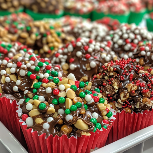 An amateur photo of a festive batch of chocolate peanut clusters, served in colorful holiday-themed paper cups. The clusters are generously coated in glossy milk chocolate and topped with red, green, and white sprinkles, adding a joyful, seasonal touch. The treats are arranged in a large white container, each cluster nestled into its red, green, or striped paper cup. The image is casual and homemade, with warm lighting that highlights the glossy chocolate and playful holiday decorations, evoking a cozy and festive feel.